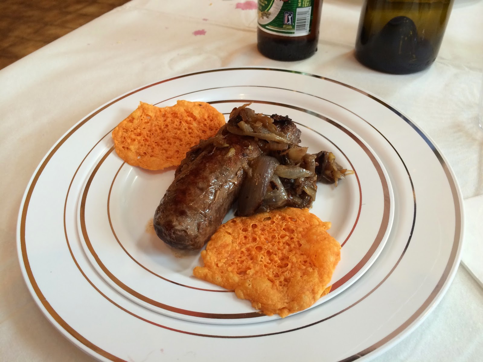 -Homemade Goose sausage with Caramelized Onions and asiago crisps